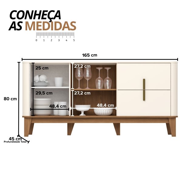 Com 165cm de largura e 45cm de profundidade, o Buffet Rael oferece um amplo espaço interno. Suas duas portas em MDF possuem puxadores de alumínio e dobradiças soft close de 35mm, As duas gavetas, com corrediças telescópicas e puxadores em alumínio, suportam até 3kg cada, e organizam talheres e acessórios.