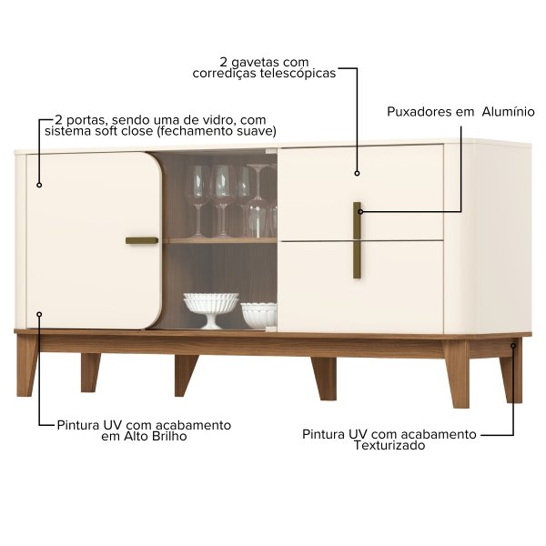 Construído em MDF e MDP, o Buffet Rael é resistente e feito para durar. O acabamento em pintura UV texturizada, além de atrativo, é suave ao toque e facilita a limpeza. Os seis pés em MDF de 20,5cm de altura complementam o design com elegância.
