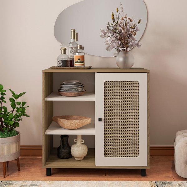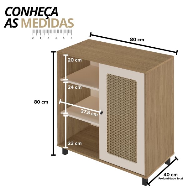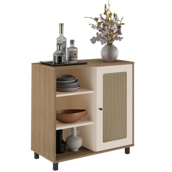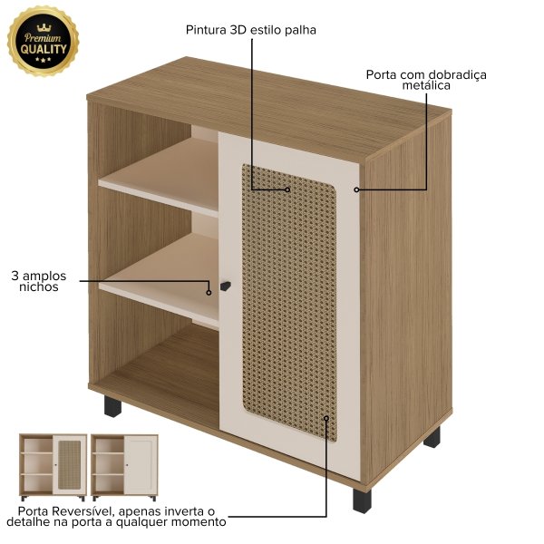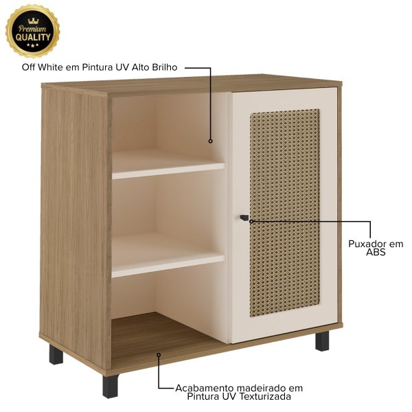 O acabamento em Carvalho, e a pintura 3D simulando a textura de palhinha, confere ao móvel um aspecto natural e rústico, enquanto o Off White adiciona um toque de sutileza e sofisticação, criando um contraste harmonioso e elegante.
