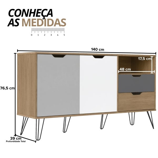 Com design contemporâneo, o Buffet Estocolmo se destaca pelos pés de aço com pintura epóxi, que garantem estabilidade e um toque moderno, harmonizando com qualquer estilo de decoração. O puxador com abertura usinada adiciona um toque de requinte e personalidade, elevando o visual do seu ambiente.