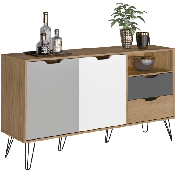 Com duas portas com dobradiças de metal de alta qualidade e duas gavetas com corrediças telescópicas, o Buffet Estocolmo oferece amplo espaço interno para você guardar seus jogos de jantar, livros de receitas, toalhas de mesa e tudo mais que precisa para um ambiente impecável. Acabe com a bagunça e deixe tudo organizado com praticidade e elegância.