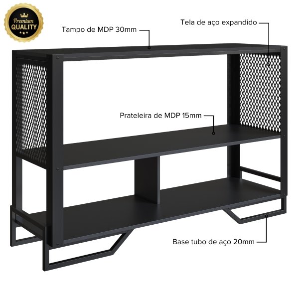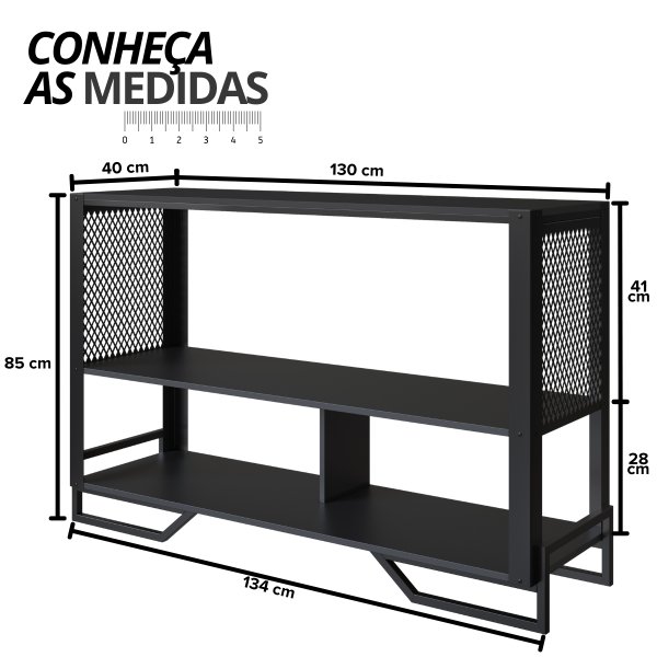 Com 85cm de altura e 40cm de profundidade, ele tem dimensões ideais para aparador. A estrutura é metálica (metal 20mm, epóxi fosco) e o tampo/base são em MDP – um painel de madeira durável e de fácil manutenção – na cor Preto. Suporta até 30kg.