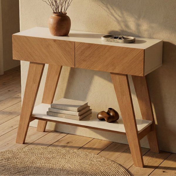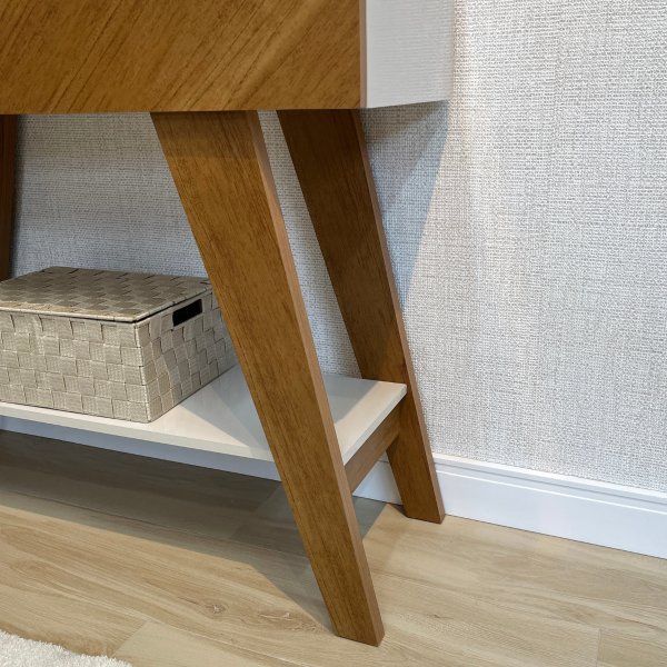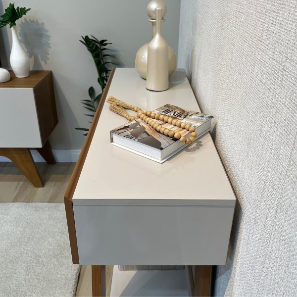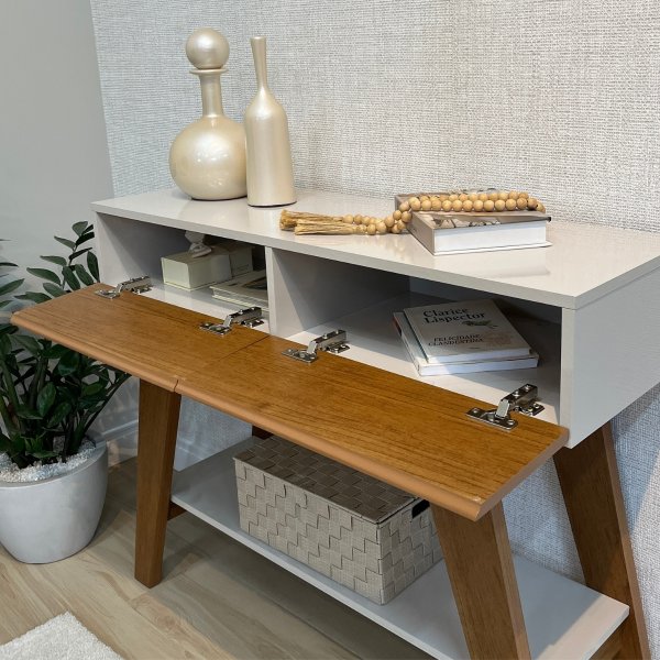 - Trânsito Livre: Com exatos 100cm de largura e 33,5cm de profundidade, este aparador encaixa perfeitamente em corredores. Você ganha circulação no ambiente, eliminando a sensação de espaço apertado e trazendo fluidez ao caminhar pela casa.