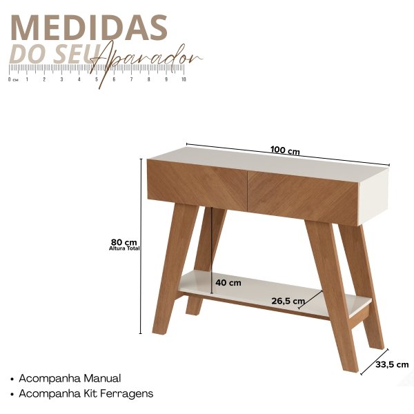 P.S.: Este aparador combina 100cm de otimização de espaço com a estética do design escandinavo. Garantia de 90 dias contra defeitos de fabricação. O acabamento misto em Cinamomo com Off-White tem altíssima saída para apartamentos recém-entregues nesta temporada.
