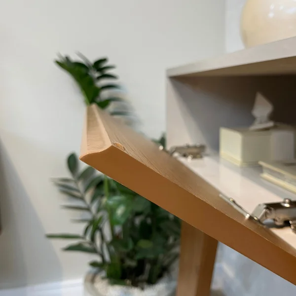 - Luz e Amplitude: O acabamento em pintura UV fosca na cor Cinamomo com Off-White reflete a luz natural do ambiente. Essa paleta clara amplia visualmente o seu espaço, criando uma atmosfera de paz logo na entrada de casa.