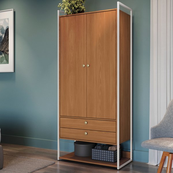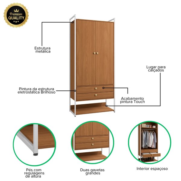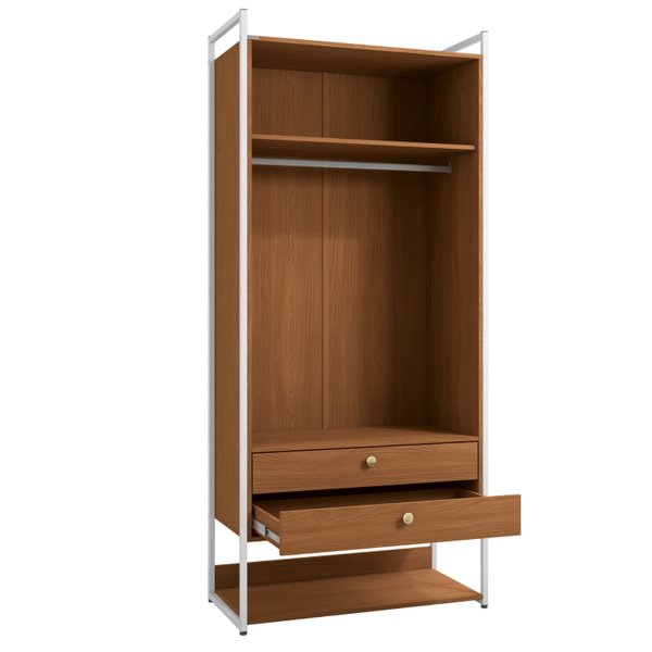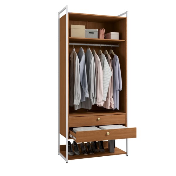 O Armário Alto Fechado Canela e Branco é a solução definitiva para quem ama o design industrial, mas prefere um visual de quarto sempre limpo e sereno. As portas protegem suas roupas da poeira, revelando um interior com organização completa: prateleira superior, cabideiro, duas gavetas grandes e uma prateleira base para sapatos.