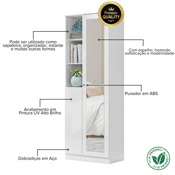 Esta é a solução 2 em 1 que seu ambiente pedia. O Armário Lince combina uma sapateira de 7 prateleiras e nichos organizadores com um espelho amplo, otimizando seu espaço de forma inteligente. Na cor branca com acabamento em alto brilho, ele reflete a luz e amplia visualmente o cômodo, funcionando como um ponto de luz e organização. É a peça perfeita para se arrumar e guardar tudo em um só lugar.