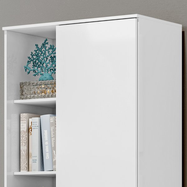 A resposta está no design puro do Armário Lince. Nesta versão, as duas portas com acabamento em alto brilho criam uma superfície uniforme e luminosa que inspira leveza e modernidade. Sem o espelho, o foco se volta para a beleza do design simétrico e para os nichos laterais, que se tornam o ponto de charme para suas decorações, mantendo o restante do ambiente visualmente limpo e organizado.