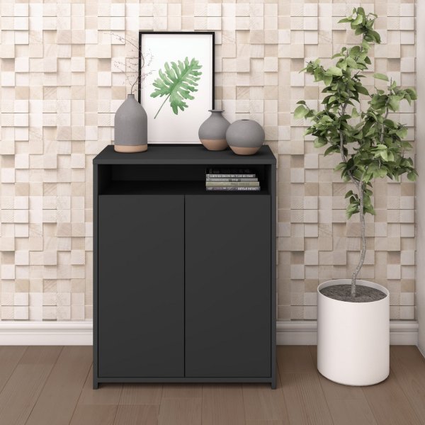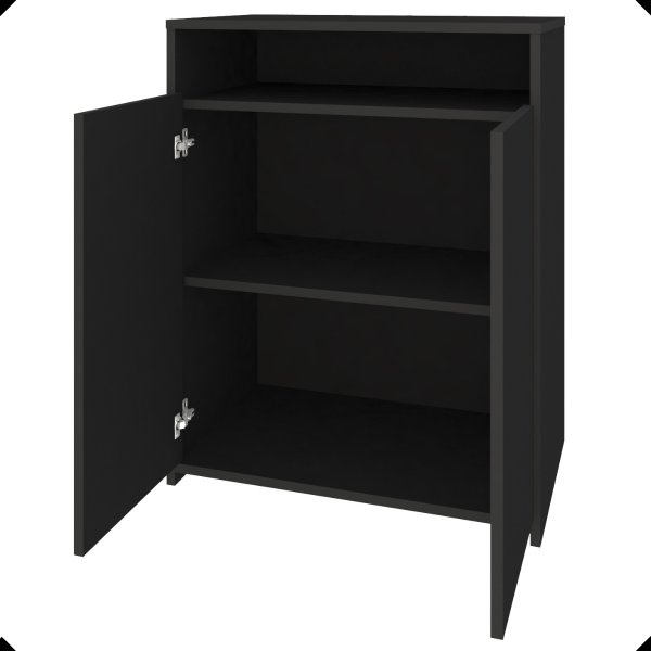 Sua cor imponente e atemporal combina com os mais diversos estilos, criando um ponto focal de destaque. A estrutura robusta em MDP com acabamento BP garante qualidade e durabilidade, enquanto a prateleira interna espaçosa acomoda seus pertences com organização.