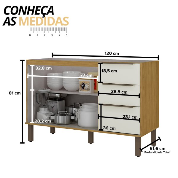 - Espaço Otimizado: Com 120cm de largura, oferece amplo espaço interno para louças e utensílios.