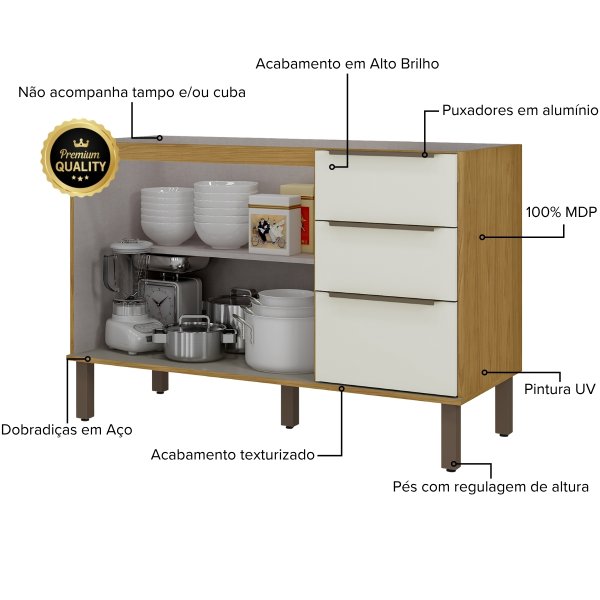 - Diferencial: 3 Gavetas com corrediças telescópicas e amplo espaço interno para otimização da área da pia.