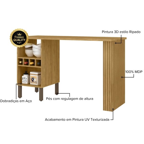 A qualidade do Balcão Ilha Verace é inquestionável, com sua estrutura robusta em MDP de 15mm e 25mm que assegura durabilidade e estabilidade. Um dos seus maiores destaques é o acabamento em pintura UV texturizada, que protege o móvel contra umidade e desgastes diários. Além disso, a lateral do balcão apresenta um elegante detalhe ripado, que é uma pintura 3D de alta qualidade, simulando com perfeição a textura e o visual da madeira ripada, conferindo um charme exclusivo e sofisticado à peça.