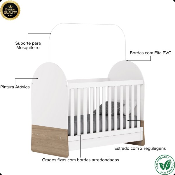 - Diferenciais: Acompanha o crescimento do bebê, design com acabamentos arredondados, grade fixa para maior segurança, suporte para mosquiteiro.