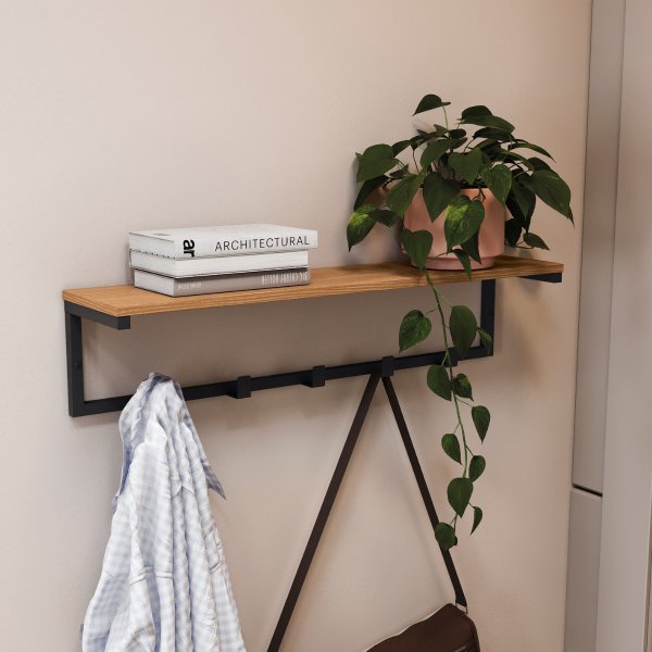 O Cabideiro Industrial resolve esse conflito: pendure tudo nos ganchos metálicos enquanto apoia a carteira na prateleira amadeirada. A Dkadi Decor garante atendimento humanizado na gestão de pedidos e logística, monitorando cada etapa para que o móvel chegue impecável à sua parede.