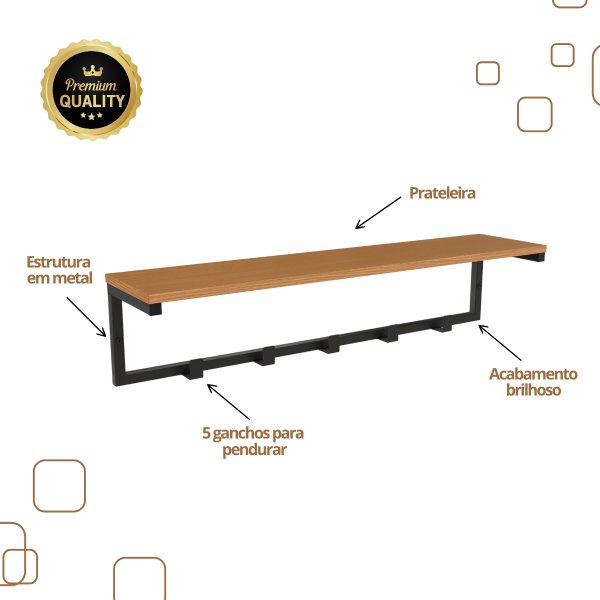 - Capacidade de Carga de 12kg: O conjunto suporta até 12kg totais, distribuindo 7kg na prateleira e 1kg por cada gancho metálico de forma equilibrada. Essa engenharia validada evita sobrecargas na parede, mantendo a fixação nivelada e segura sob uso intenso.