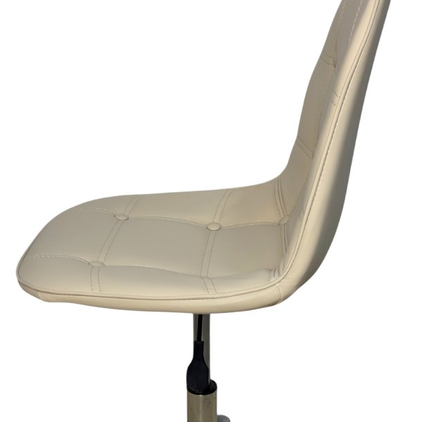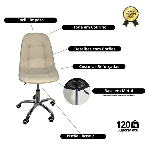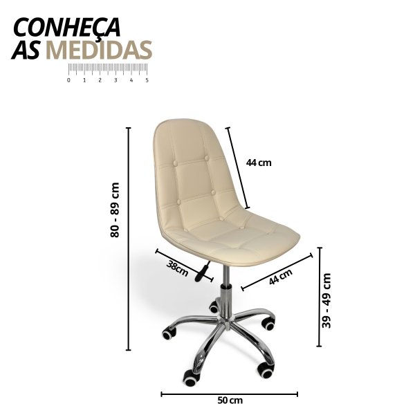 Desfrute de um conforto inigualável com a Cadeira Eiffel Botonê Nude. Seu assento, feito em polipropileno de alta resistência, espuma de densidade D28 e revestido em couro sintético PU, é um convite ao relaxamento produtivo. Ajuste a altura do assento (de 38cm a 48cm do solo) para uma ergonomia perfeita. A base cromada giratória, com cinco rodízios de silicone, facilita a movimentação. Os detalhes em botonê são um charme à parte. Veja as fotos em alta definição que mostram a qualidade da costura e a textura do material.