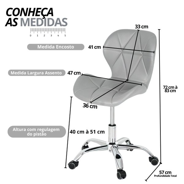 Com base em metal cromado de alta qualidade, a cadeira suporta até 120kg, garantindo uma estrutura robusta e durável que acompanha o ritmo intenso do seu dia a dia profissional.
