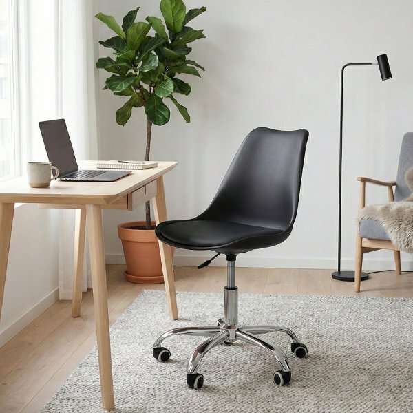 A Cadeira Ícaro preta é a resposta. Ela une a elegância atemporal do preto à ergonomia do assento estofado. Seja para um home office ou ambiente corporativo, seu design se impõe com profissionalismo, enquanto a regulagem de altura garante a postura ideal, uma combinação que a Dkadi Decor busca em seus produtos.