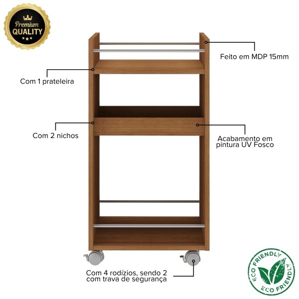 - Mobilidade com Segurança: Equipado com 4 rodízios que deslizam suavemente e possuem travas de segurança para fixar o carrinho onde você desejar.