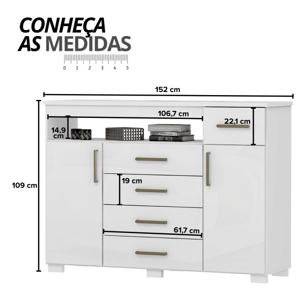 Pode confiar na qualidade. Esta cômoda recebe uma pintura UV de última geração com acabamento em Alto Brilho, que cria uma camada protetora resistente e garante um branco que permanece branco. Além da beleza, o tampo de 25mm de espessura oferece uma bancada robusta para seus objetos de decoração, perfumes ou até uma TV, sem medo de danificar o móvel.