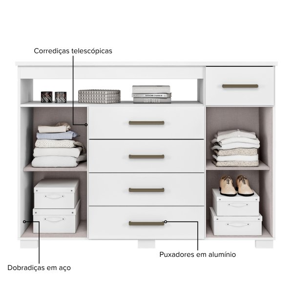 Ela é a união perfeita entre os dois. Com 1,52m de largura, foi projetada para máxima organização. As 4 gavetas espaçosas, com corrediças telescópicas que abrem por completo, são robustas e ideais para guardar suas roupas de forma organizada. As 2 portas laterais revelam prateleiras para sapatos ou caixas, e o nicho central é perfeito para aparelhos eletrônicos ou livros.