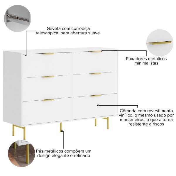 - Design Minimalista e Elegante: A cor branca com acabamento semi-brilho e os puxadores e pés metálicos criam um visual contemporâneo que se integra perfeitamente a qualquer decoração.
