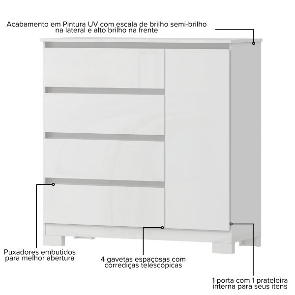 Cômoda Vega 4 Gavetas e Armário - Branca: O Jogo de Brilhos que Sofistica seu Ambiente