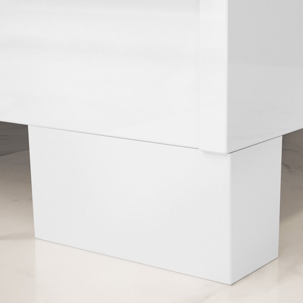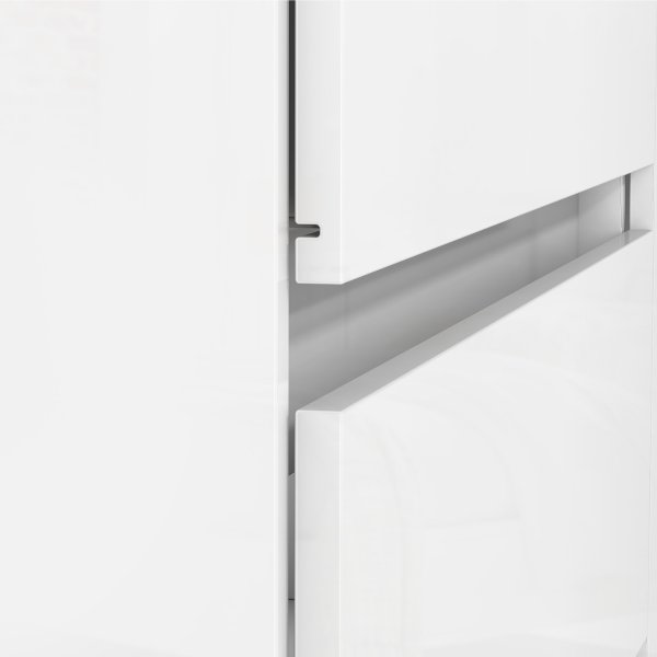 Através do contraste inteligente de acabamentos. A estrutura da Cômoda Vega possui um elegante acabamento semi-brilho, enquanto as frentes da porta e das 4 gavetas recebem um acabamento em alto brilho. Este jogo de luz cria uma percepção de profundidade e um visual sofisticado, que é realçado pelo design clean com puxadores recuados.