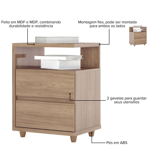 - Material da Estrutura: Misto em MDP e MDF (Fundo das gavetas e costas)