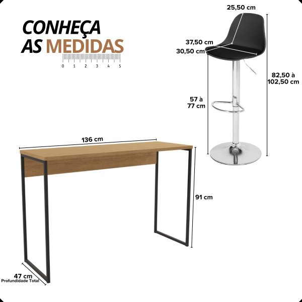 - Altura das Banquetas: 82,5 cm a 102,5 cm (Total) / 57 cm a 77 cm (Assento)