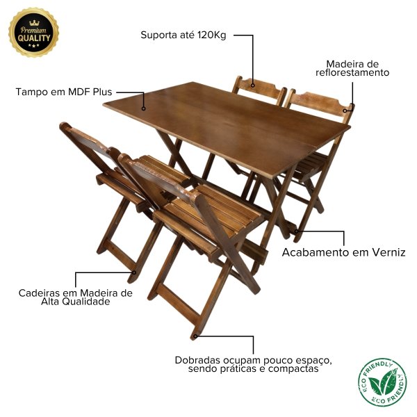- Solução para Espaço: Por ser totalmente dobrável e compacto, é a solução perfeita para quem precisa de uma mesa de 4 lugares, mas não tem espaço fixo para ela.