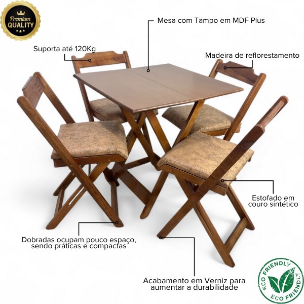 - Qualidade Superior: Estrutura em madeira maciça de eucalipto, tampo em MDF e cadeiras que suportam até 120kg.