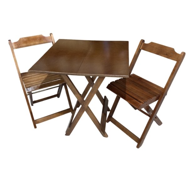 Com o Conjunto Dobrável! Perfeito para cozinhas, varandas ou qualquer cantinho, esta mesa quadrada (70cm por 70cm) e suas duas cadeiras são a solução ideal para otimizar seu espaço com o charme da madeira maciça na cor Imbuia.