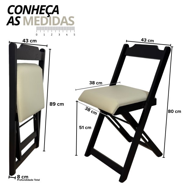 - Cadeiras: 79cm (altura) x 42,5cm (largura) x 35cm (profundidade)