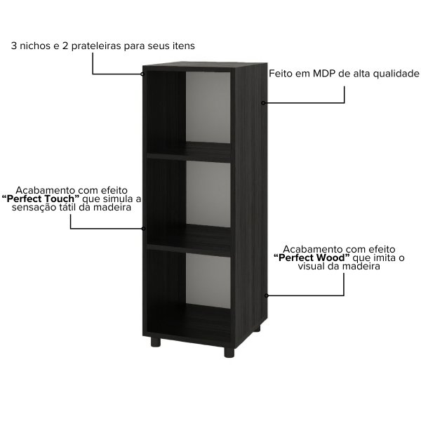 Fabricada em MDP de alta qualidade com acabamento em *Perfect Wood e *Perfect Touch, a Estante Austin Preta é sinônimo de durabilidade e requinte. Sua estrutura robusta suporta até 12 kg, distribuídos entre as prateleiras e nichos, garantindo que seus objetos fiquem seguros e organizados por muito tempo.