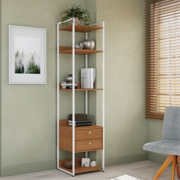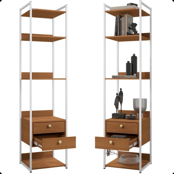 A Estante Torre Multiuso Crome Industrial Canela e Branco é a solução definitiva para espaços compactos. Com apenas 48,5 cm de largura, ela transforma cantos esquecidos em centros de organização. Sua estrutura metálica branca traz a leveza do "Industrial Leve", ampliando o ambiente. Ela combina prateleiras de exposição com a discrição de duas gavetas com corrediças telescópicas. Perfeita para home offices ou salas que precisam de organização máxima sem pesar no visual.