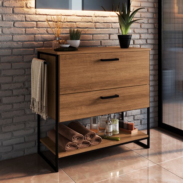 Você acaba de encontrar. Este Gabinete na cor Mel foi projetado como a base ideal para seu projeto. Ele oferece o autêntico design industrial, com estrutura em metal e o charmoso tom amadeirado, dando a você total liberdade para harmonizá-lo com a cuba que sempre sonhou.