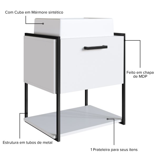 - Diferencial Principal: Ideal para espaços reduzidos, acompanha cuba em mármore sintético.