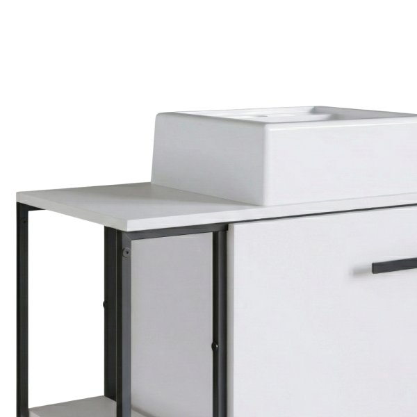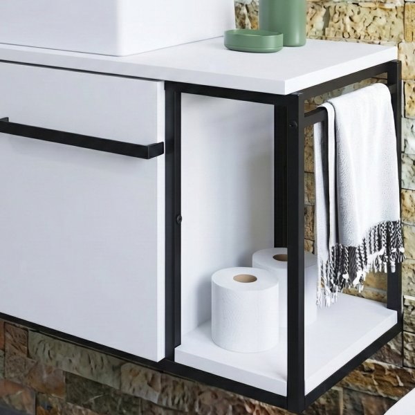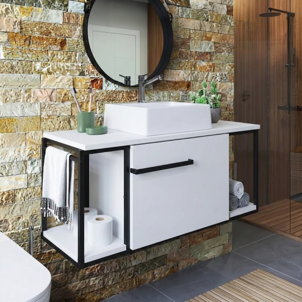 Para os amantes do minimalismo, o Gabinete Industrial Branco com Cuba Ametista Branca é a escolha definitiva. A fusão "All White" da cuba quadrada com o móvel cria uma sensação imediata de limpeza, luz e amplitude. As linhas retas da cuba e a estrutura metálica sutil impedem que o visual fique monótono, adicionando textura e modernidade a um banheiro que transmite paz e organização.