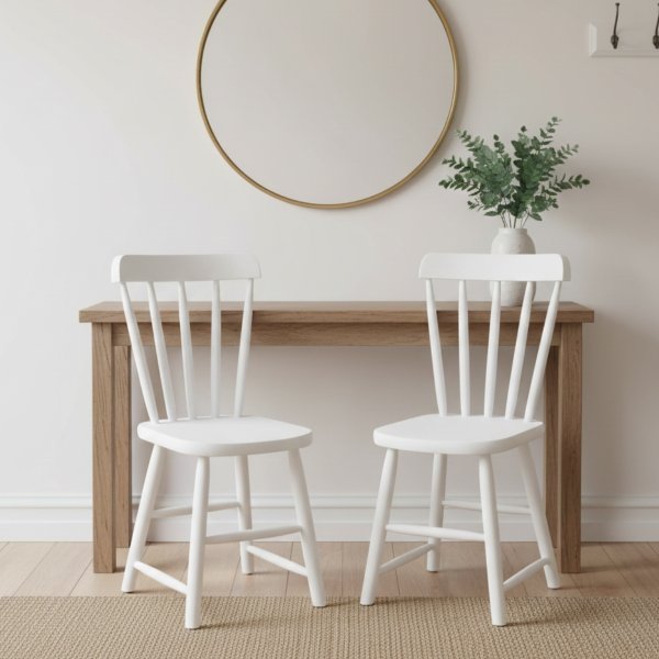 A estrutura em madeira maciça de eucalipto garante resistência e longevidade às Cadeiras Espanha, enquanto o acabamento em pintura PU branco fosco protege e valoriza a peça.