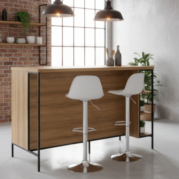 - Componentes: 1 Bancada Gourmet Ilha Industrial, 2 Banquetas Altas Ícaro