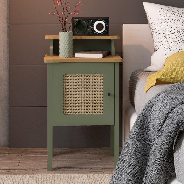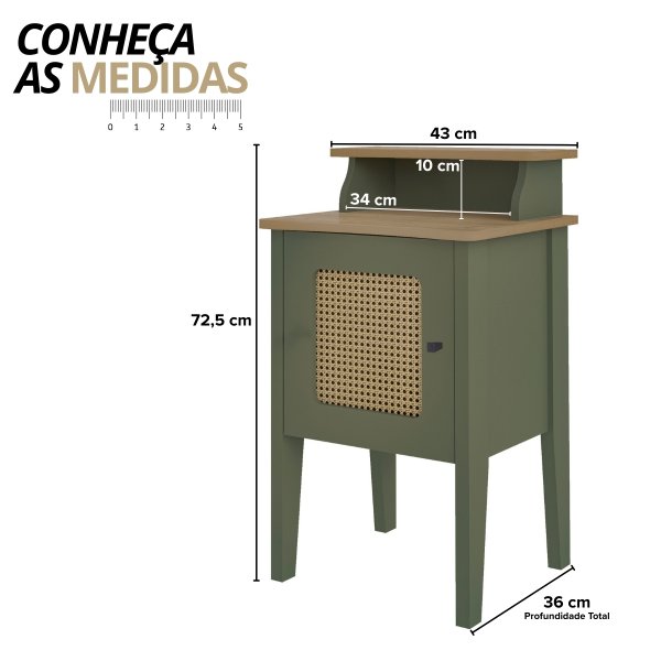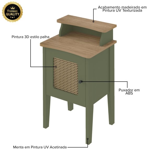 Com detalhes laterais arredondados e porta com pintura 3D que simula os detalhes em palhinha, a Mesa de Apoio Charlotte na cor Menta/Carvalho oferece um toque suave e delicado ao ambiente. Seu design moderno e funcional é perfeito para quem busca otimizar o espaço sem abrir mão do estilo.