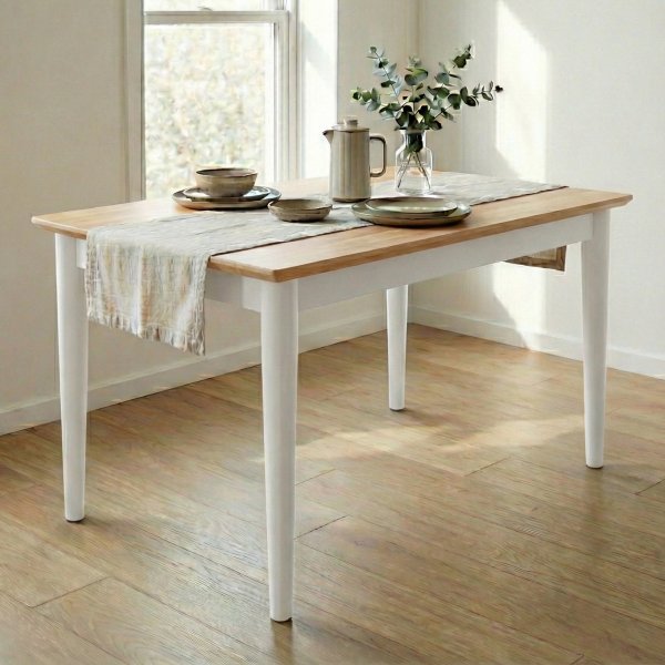 A estrutura em madeira maciça de eucalipto, com acabamento branco fosco em PU, é resistente e fácil de limpar. O tampo, também em madeira maciça, recebe acabamento natural em PU, que realça a beleza da madeira. Uma mesa que une praticidade e beleza, com tampo de 30mm de espessura, suporta 120kg.
