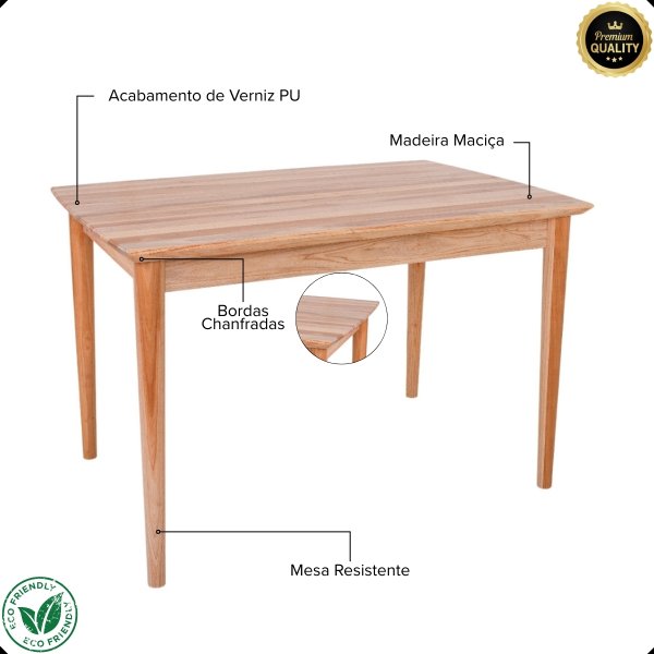 Produzida 100% em madeira maciça de eucalipto, de fontes renováveis, a Mesa Milena é feita para durar. O acabamento em PU preserva a beleza natural da madeira e facilita a limpeza. Resistente, ela suporta até 120kg com seu tampo de 30mm de espessura.