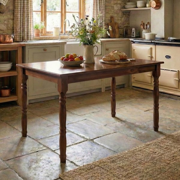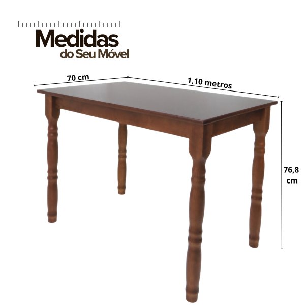 A Mesa Dalas Nozes é feita com estrutura em madeira maciça de pinus, que garante a resistência, e tampo em MDF de 18mm, que garante durabilidade. O acabamento em verniz PU no tom Nozes valoriza a madeira e protege a peça.