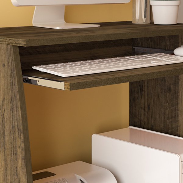 Com espaço dedicado para CPU, impressora e teclado retrátil, a mesa compacta em pinho oferece organização e praticidade para seu dia a dia. As corrediças telescópicas de aço garantem um deslize suave da gaveta (com capacidade para até 4kg!), e o tampo e as laterais curvos em MDF de 15mm, com revestimento BP que protege contra umidade e arranhões, proporcionam durabilidade e um toque de requinte.