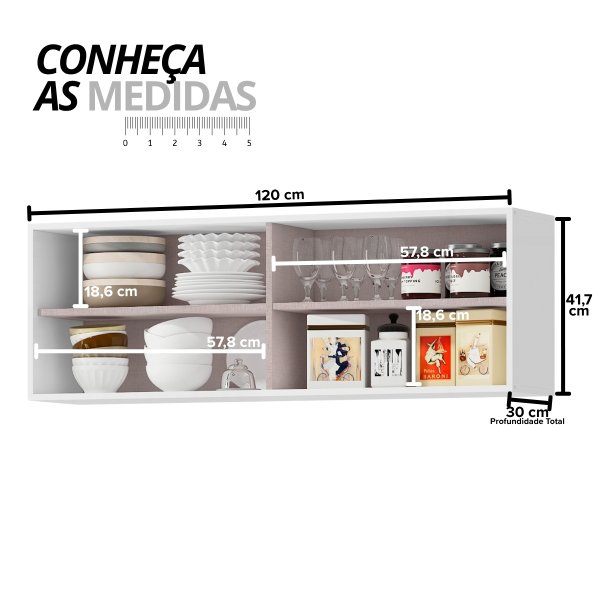 - Organização Versátil: Com 120cm de largura, oferece espaço otimizado para louças e acessórios, com prateleira interna para melhor distribuição.
