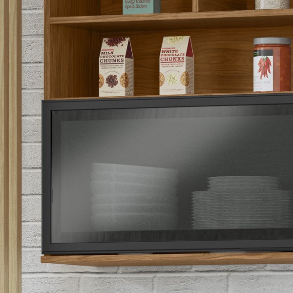 - Porta Basculante com Pistão a Gás: A grande porta de vidro se abre para cima com suavidade e se mantém aberta, facilitando o acesso ao interior do armário.