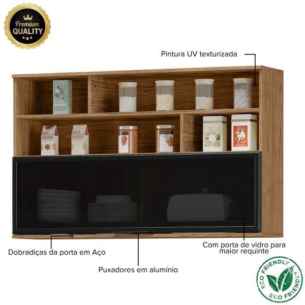 Este Módulo Aéreo foi projetado com esse equilíbrio perfeito. Na parte de cima, nichos abertos oferecem o espaço ideal para seus temperos e potes mais usados, agilizando sua rotina. Na parte de baixo, uma ampla porta basculante de vidro fumê esconde e protege itens maiores como pratos e travessas, mantendo a organização visual do ambiente.