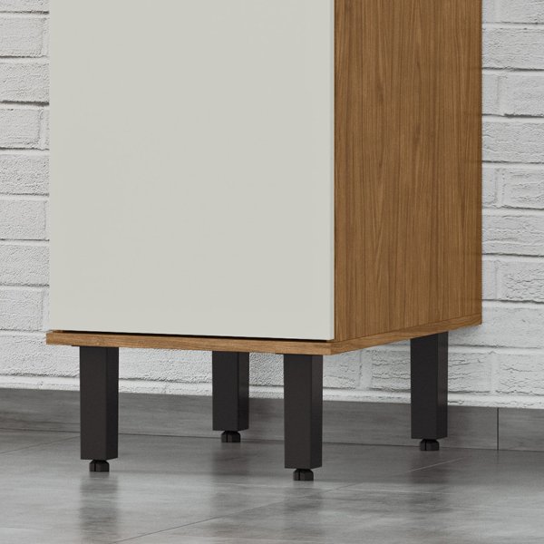 Sim, e o segredo está na combinação de acabamentos. Este módulo une o calor da estrutura em madeira Freijó texturizada com a leveza da porta em Off White de alto brilho. O resultado é um contraste sofisticado que ilumina o ambiente, mantendo a sensação de conforto. É o equilíbrio perfeito para uma cozinha moderna e acolhedora.